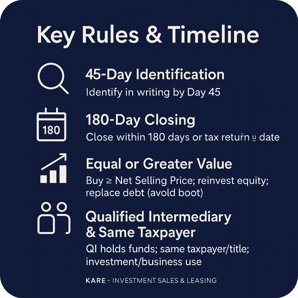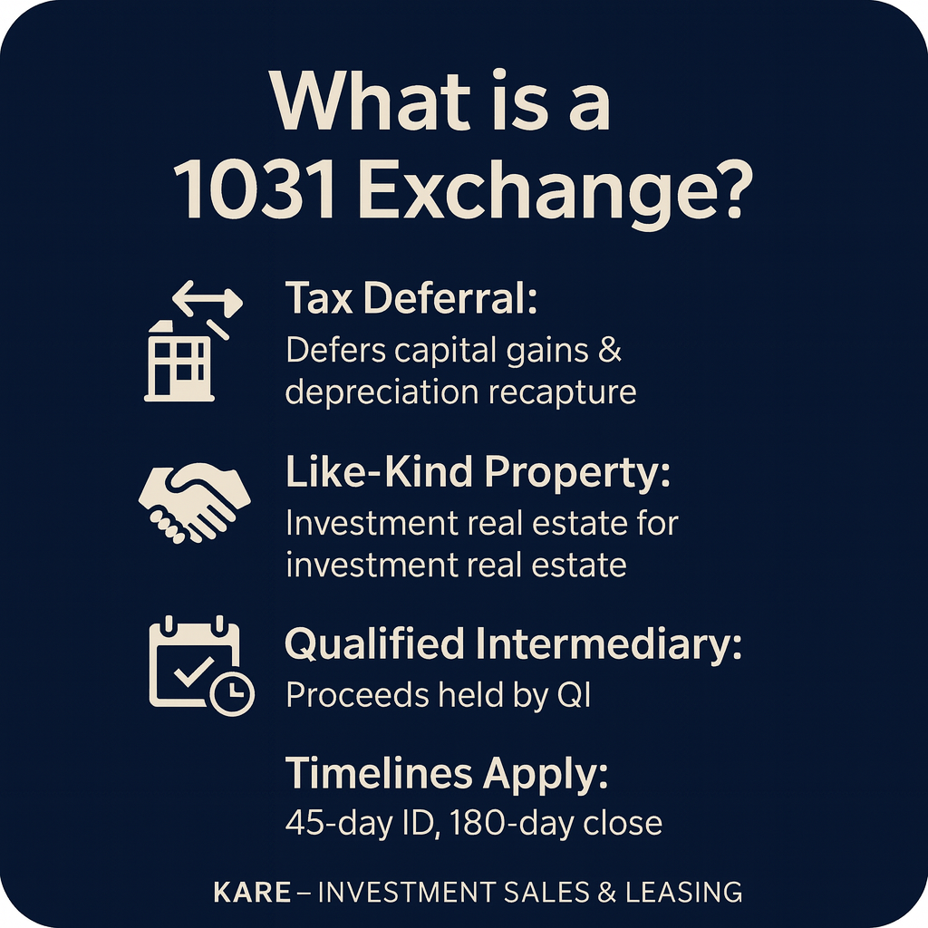 A 1031 Exchange allows investors to defer capital gains taxes by reinvesting proceeds from the sale of one property into another “like-kind” property. At KARE Investment Sales & Leasing, we guide our clients through every stage of the exchange process, ensuring compliance with IRS regulations while maximizing investment outcomes.