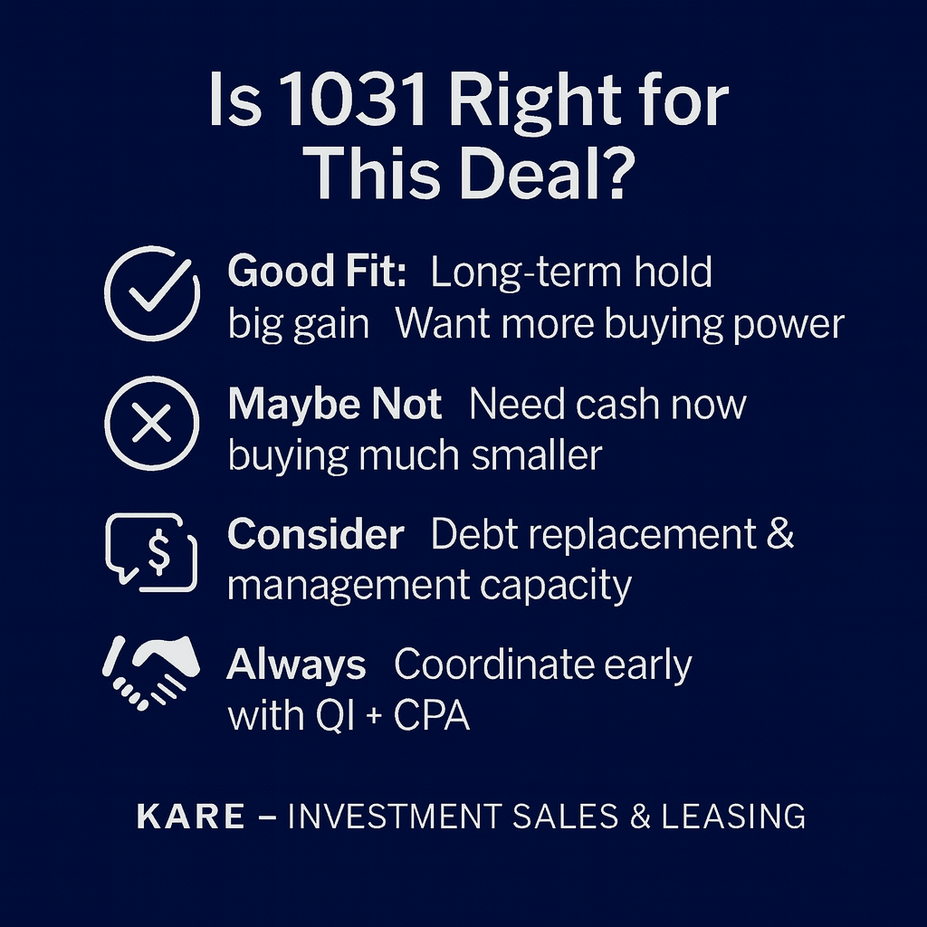 A 1031 usually fits when you have a large unrealized gain and want to scale or reposition into equal-or-greater-value investment property.