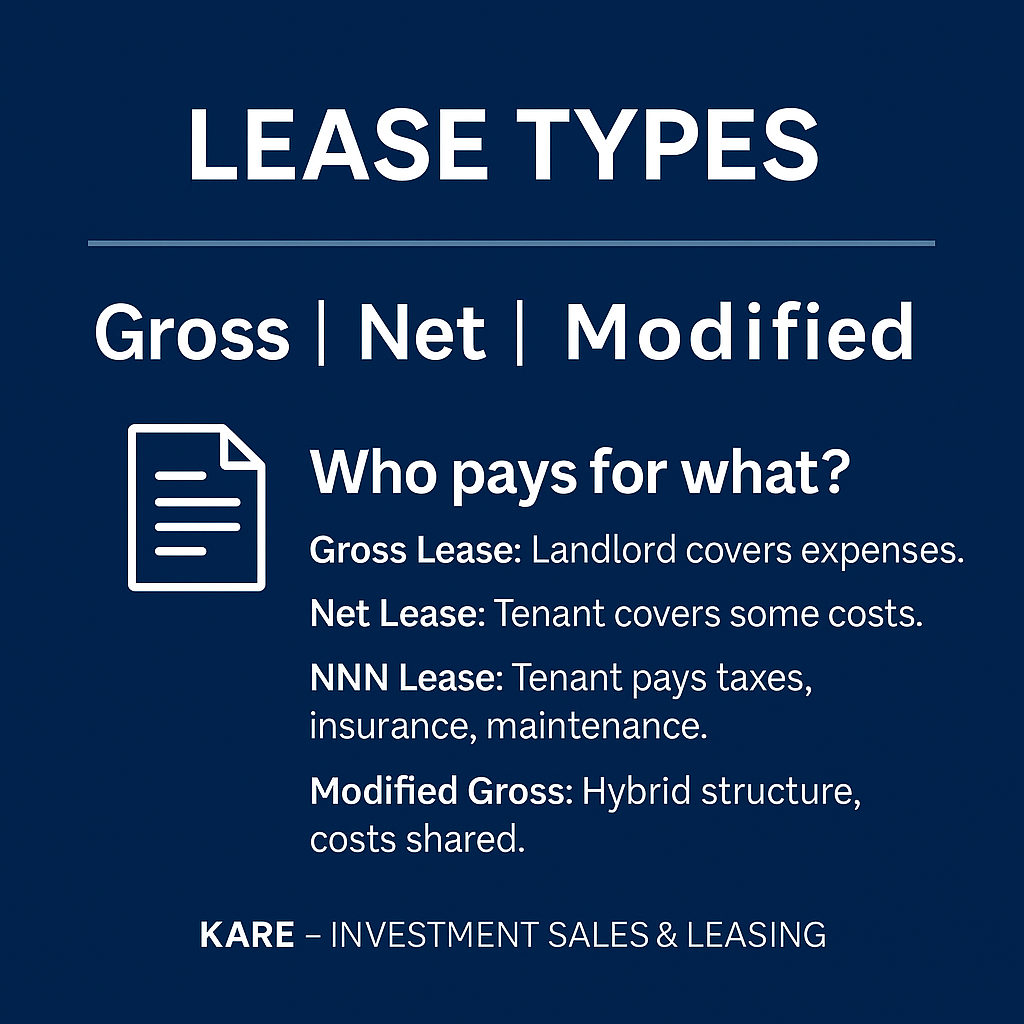 NNN Lease: Popular for retail/industrial; tenant handles taxes, insurance, and maintenance.